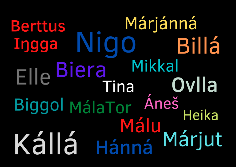 In Olmmáivággi, we see that parents are by far the largest group of first links in the name. As many as 78.7 % of the people have been named after their parents. 114 people had the first part of their name named after their mother and 107 had the first part named after their father. Thirty-five people had a place name as the first part of their name. It seems that it was common for people on the outskirts of the village to be mentioned with a place name. Examples are Váddj Ántun and Skuole Hánsa. Another type of name is from places outside the village. People who moved in sometimes brought the place name with them from their hometown. Examples are Gáivuon Biera, Buljohk Áne and Ittarvuon Juhán (The place names can be searched for on norgeskart.no).