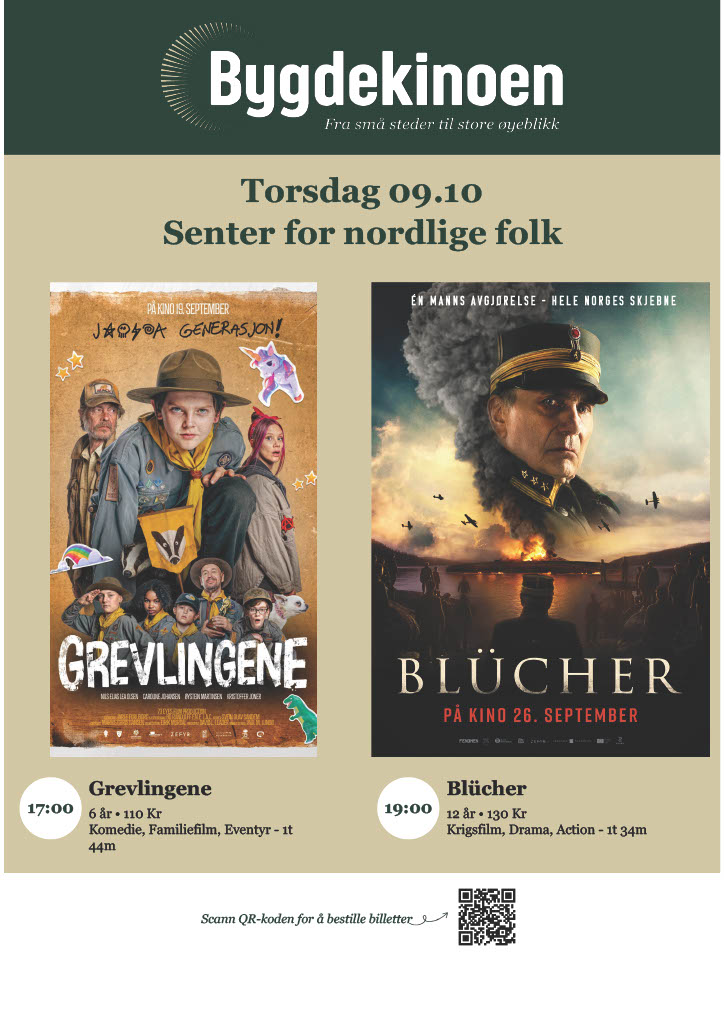 Torsdag 9. oktober blir det bygdekino igjen her på Senter for nordlige folk, og filmene du kan se denne gangen er Grevlingene kl. 17.00 og Blücher kl. 19.00.