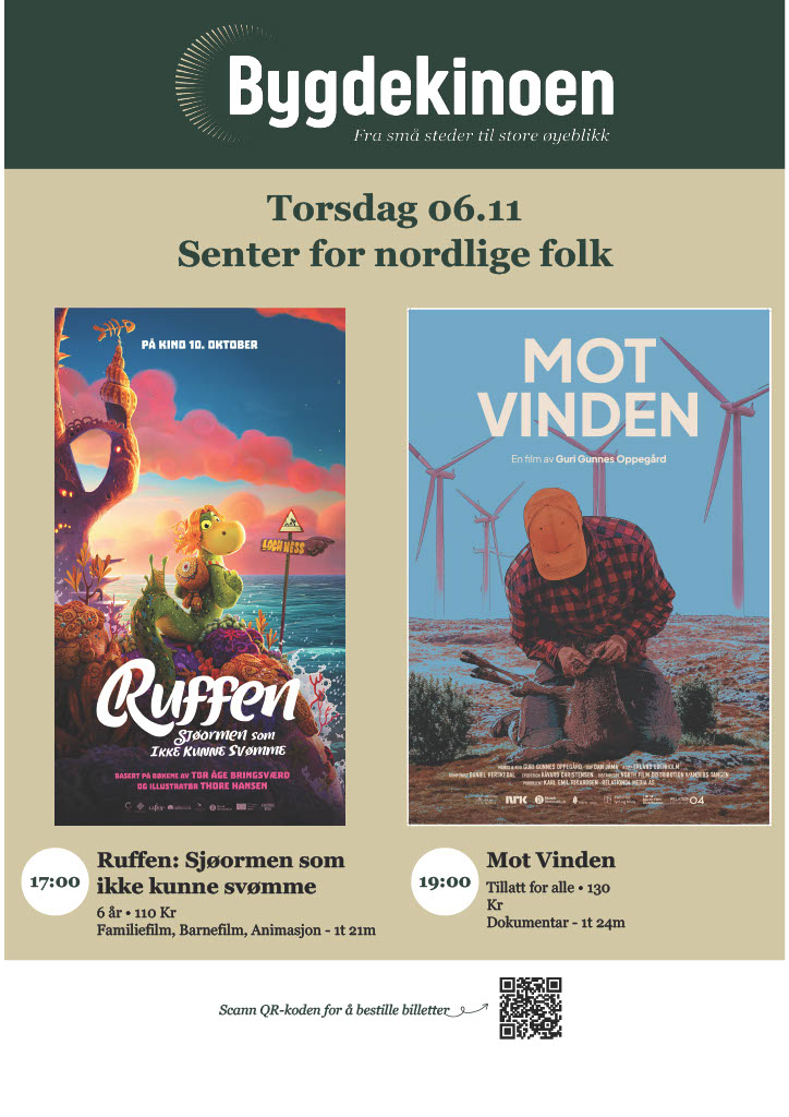 Torsdag 6. november blir det bygdekino igjen her på Senter for nordlige folk, og filmene du kan se denne gangen er Ruffen: Sjøormen som ikke kunne svømme og dokumentaren Mot Vinden.