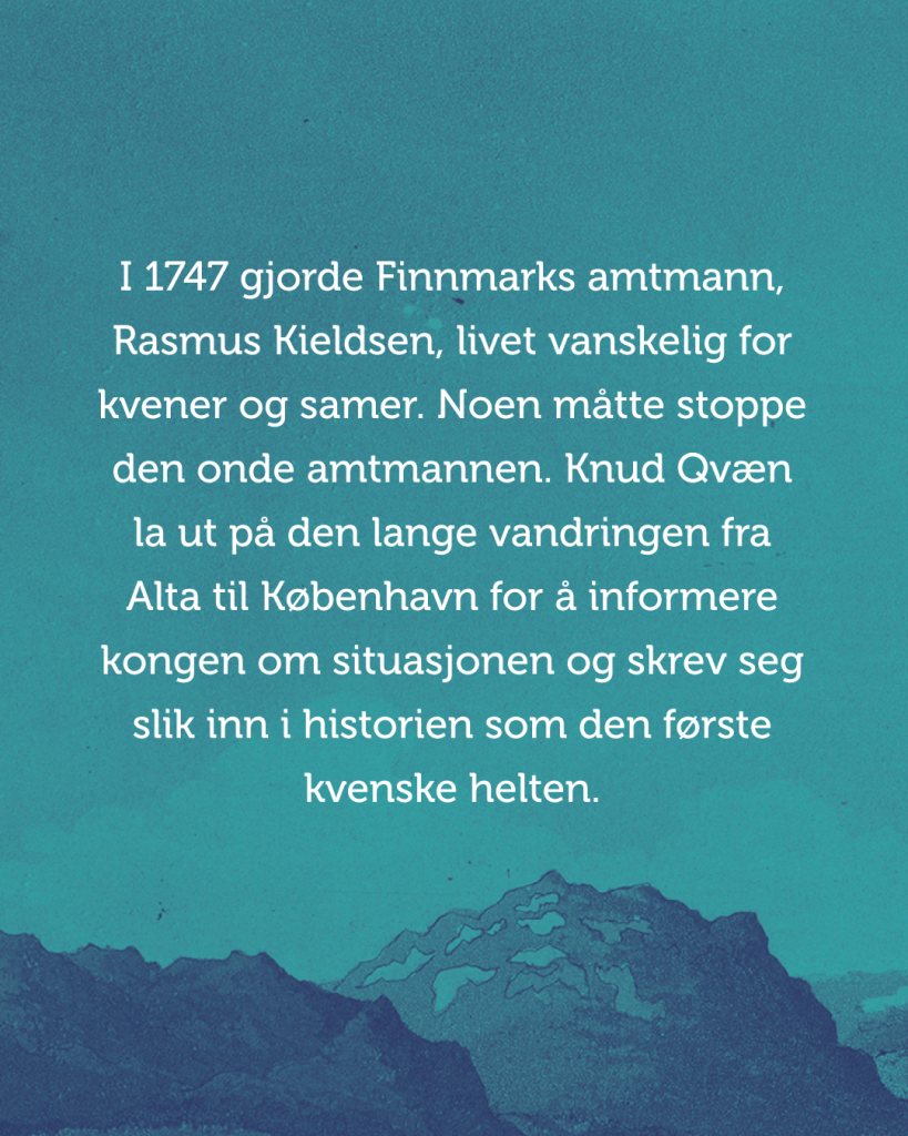 I 1747 gjorde Finnmarks amtmann, Rasmus Kieldsen, livet vanskelig for kvener og samer. Noen måtte stoppe den onde amtmannen. Knud Qvæn la ut på den lange vandringen fra Alta til København for å informere kongen om situasjonen og skrev seg slik inn i historien som den første kvenske helten.